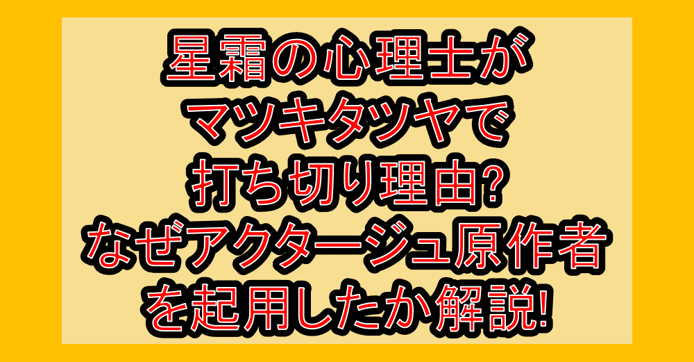 星霜の心理士がマツキタツヤで打ち切り理由?なぜアクタージュ原作者を起用したか解説! 公開日:2026年3月2日 漫画 「星霜の心理士」は「マンガワン」で連載しているのですが、「堕天作戦」「常人仮面」の作者問題が来ている最悪のタイミングで原作者が「アクタージュ」で逮捕打ち切りにしたマツキタツヤ氏だということで話題なっています。 ⇒マンガワ […] 続きを読む
